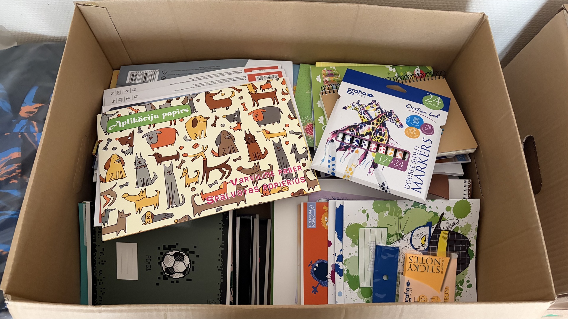 Mokiniai dovanojo spalvoto ir piešimo popieriaus, įvairias kanceliarines priemones, spalvinimo knygeles, saldumynus.